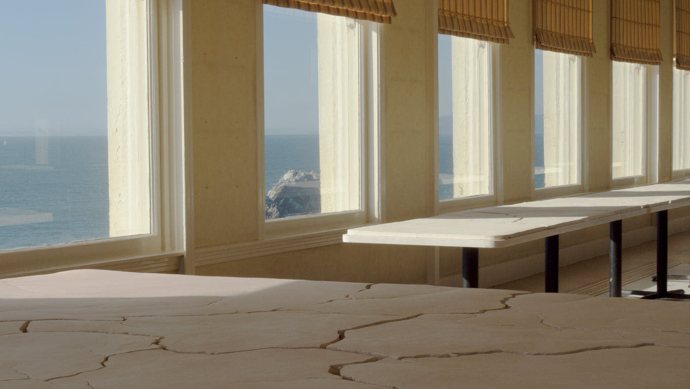 We were inspired by the proposed project: Inside the empty restaurant, Goldsworthy planned to cover the old dining tables with raw white clay—a reference to white table cloths and formal dinnerware—then leave it subject to the elements, evolving over the duration of the exhibition. Though Andy was unable to come to California to install with us, we worked with the inimitable curator Cheryl Haines, director and founder of FOR-SITE Foundation; as well as artist Jaimie Healy and our entire Heath Clay Studio team to plan and execute the work.