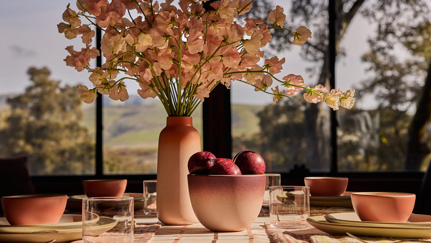 This season’s palette celebrates the moodier side of summertime across a range of delicate pinks (Rosalba and Grapefruit), sun-faded reds (Desert), and deep purples (Taproot—a reference to the first phase of a seed’s growth). The latter serves as the collection’s foundational color, giving you a bold, robust base upon which to layer the lighter hues. Several pieces feature our classic Fade technique, showcasing two glazes at once in a gentle gradient that evokes a setting sun.