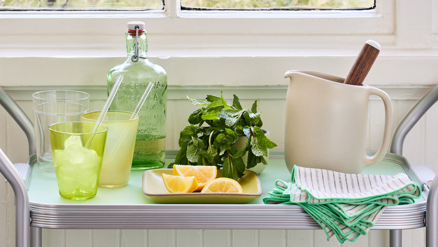 Heath and Kaymet were born around the same time, in the late 1940s, though more than an ocean apart. Kaymet products were first produced at a factory on Kennington Lane, near the Elephant & Castle, London. Their aluminum bowls, trays, and trolleys are made by hand, start-to-finish in the UK. For the summer collection, Kaymet made trolleys in two colors—soft green and bright yellow—which are not only charming on their own, but beg to be adorned with cool drinks and crunchy snacks, and wheeled out into the sun.