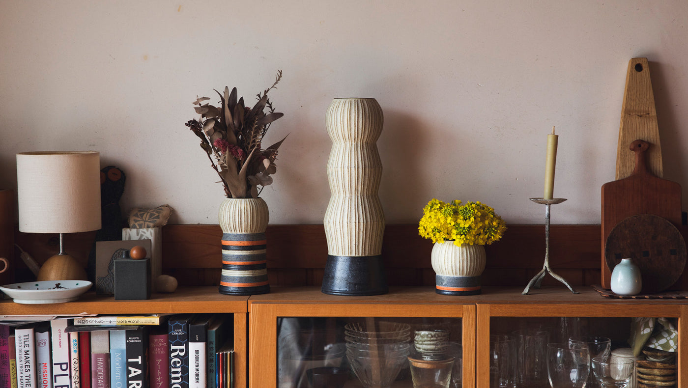 shinogi carving techniques. The ceramist has been collaborating with the team at Heath since 2009; for this year’s presentation, “A Single Line will Lead Me,” opening this week, he challenged himself to move away from functional pieces like, say, mugs and saucers and instead create vessels, sculptures, vases, totems and other artistic one-offs that are primarily meant to be displayed. (In variegated stripes of gray, umber and marigold, the items would look especially nice nestled between books on a shelf.) “Akio’s 59, and his body is telling him to slow down,” says Tung Chiang, Heath’s studio director. “It’s not about making more work but about making more