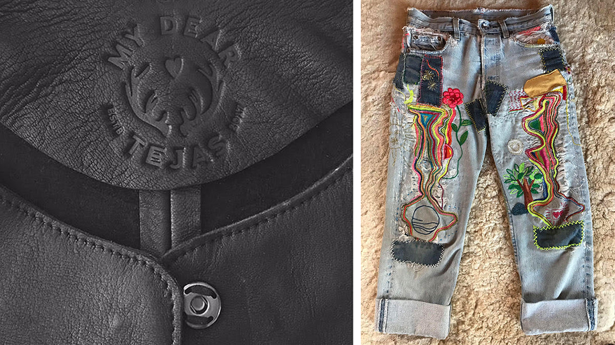 "I have named these Levi's, Therapy Pants. The past 10 years have not been the easiest in many ways - moving businesses, moving homes, love found, love lost, etc. - but I am so grateful that there is always hope and love. With each stitch, I think of love, hope, perseverance, pain, laughter, beauty, nature, friendship, etc. and I find happiness and calmness."If the workshop's not in the cards for you this time around, never fear—Susan will be at Heath all weekend to share a selection of women’s jackets and small leather goods. Made from sustainably sourced American deerskin, Susan's designs have always been a treat at our annual Make Good Market in San Francisco. She’ll be at Heath LA all weekend, so swing by, say hello, and scoop up a jacket of your own!