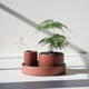 This form is designed as an interdependent trio of elements. The outer tray catches and holds water, and the larger inner piece is intended for moisture loving plants like ferns, which enjoy consistent humidity. The small cylinder is open on both ends, intended as a bottomless vase that lives within the saucer and depends on the water around it to sustain its contents. — Tung Chiang